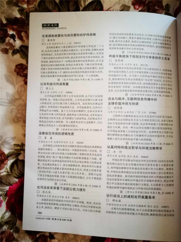 近日,我院环境资源法硕士点负责人、贵州省社会科学联合会生态法治创新团队首席专家方印教授于《贵州大学学报》(哲学社会科学版)2016年第5期刊发的《认真对待环境法哲学与环境法解释学》相继被《人大复印资料》2017年第4期全文转载、被《高等学校文科学术文摘》2017年第1期卡片转载。