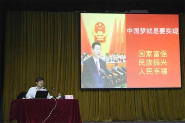 郑校长以轻松幽默、激情生动的话语和深入浅出的讲解引起了全场听众的强烈共鸣。他结合“国家富强、民族振兴、人民幸福”三个维度和“道路自信、理论自信、制度自信、文化自信”四个自信深入阐述了中国梦的内涵和价值。