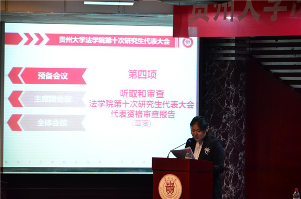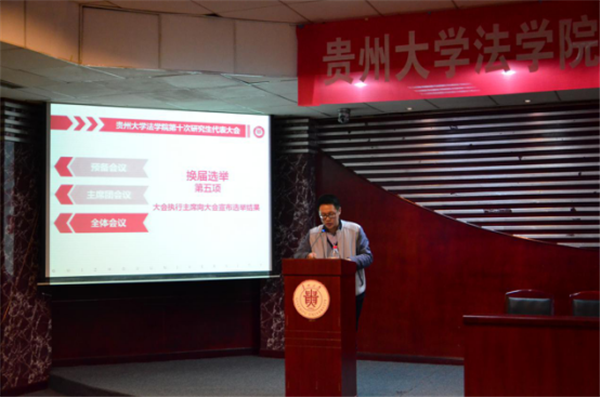 贵州大学法学院第十次研究生代表大会由预备会议、主席团会议和全体正式会议组成。下午2点,贵州大学法学院第十次研究生代表大会预备会议正式召开,大会听取了筹备委员会委员刘橙的《筹备工作报告》和主任委员李玥的《代表资格审查报告》,大会审议通过了大会议程(草案)、代表资格审查委员会名单(草案)、主席团名单(草案)、大会秘书长名单(草案)。