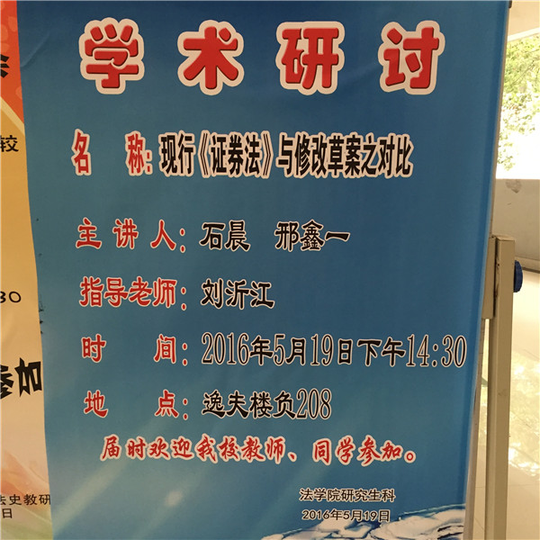 2015级研究生经济法学术研讨会于2016年5月19日下午14时30分在逸夫楼负208室召开,历时两个半小时。此次研讨会由刘沂江老师作为指导教师,研讨主题为“现行《证券法》与修改草案之对比”的问题,主讲人为2015级的邢鑫一和石晨两位同学。参与本次探讨会的人员主要有2015级经济法全体研究生,研讨会通过主讲人报告其研讨内容,同学根据其报告内容提问、展开讨论,最后由指导老师点评等方式完满结束。