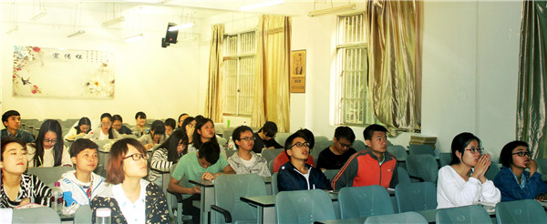 互动环节中,针对周老师提出的“为什么要读大学”的问题,14级王晶同学上讲台发表了自己的观点。对大家提出的问题,周老师也一一认真地做出了回答.