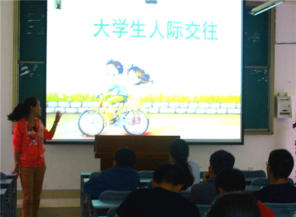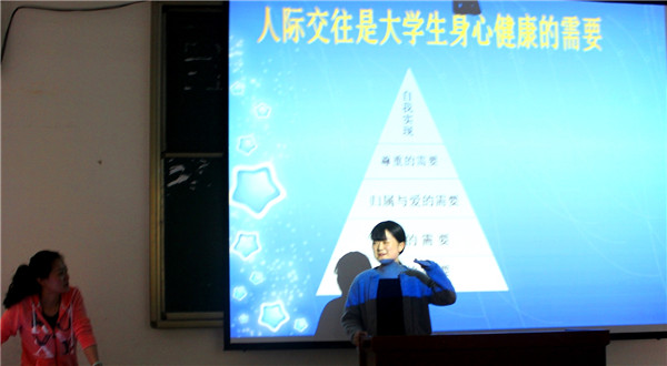 讲座伊始,周欢老师开门见山地向同学们说明了本次讲座的背景与目的。5月25日是世界心理健康日,“5·25”谐音是“我爱我”的意思,希望同学们多多重视自己的心理健康,做一个内心充满阳光,积极向上的人。在心理健康日来临之际,希望借此次讲座来和大家交流沟通一下,了解一下大家心理方面存在的一些问题,并给予同学们一些解决心里问题的有效途径,希望能够以点带面为同学们今后跨入社会进行人际交往时有所帮助。 讲座中,周欢老师阐述了合作的重要性。她认为每个人都有自己的独特性,“三人行,必有我师”,通过大家的合作才能把事情做的尽善尽美。说明了积极融入社会,与人交往合作的重要性。其次,她向大家分别详细讲述了尊重他人是一种修养,要学会换位思考,学会有效沟通,以及我们要学会自我实现,勇于展现自己等相关话题。