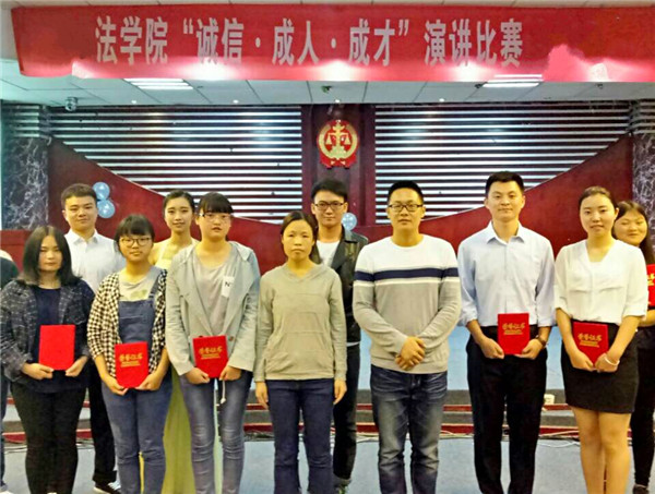 为了进一步营造诚信、守约的文明之风,推进学生道德素质和精神文明的提高,5月18日晚上7点,我院在北校区模拟法庭举办了以“诚信、成人、成才”为主题的演讲比赛。担任本次比赛的评委有:法学院学生科科长兼团委书记贺明吓老师、法硕中心刘杰老师、团委学生会第五届学生会主席牟启蔚同学。主持人为许婧昳。本次演讲比赛共有四组选手参加比赛。比赛形式多种多样,第四组选手在演讲中融入了舞台剧等形式,新颖的演讲方式独特且精彩,第三组选手在演讲中加入了朗诵等形式,赋予演讲独特的含义。选手们通过一些小故事、小事例展示了诚信了重要性,赢得了观众及评委的掌声和好评。