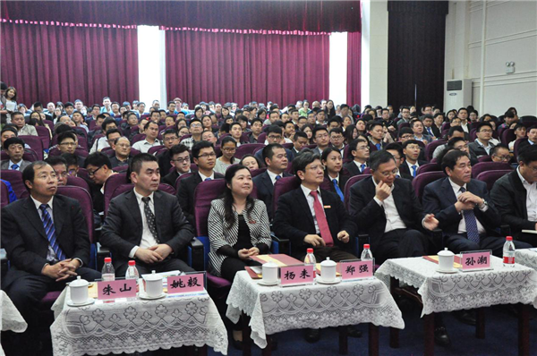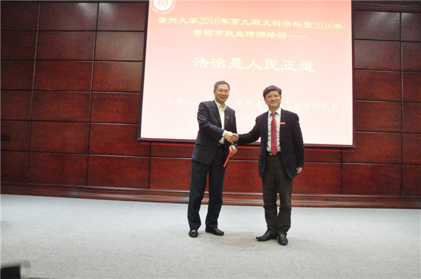 4月15日上午,贵州大学2016年第九期文科讲坛暨2016年贵阳市执业律师培训在我校行政楼学术报告厅举行。贵州省高级人民法院院长孙潮、常务副院长朱玉、校党委书记陈坚、校长郑强、校党委副书记杨未、省律师协会会长包洪臣、副会长姚毅、朱山、省律师协会副会长、贵阳市律师协会会长屈超勇、省律师协会秘书长陈会琪出席会议。会议由副校长向淑文主持。贵州省高级人民法院、贵州大学、贵州省律师协会、贵阳市律师协会的领导和来自贵阳市的部分律师、以及我校干部师生代表共300余人参加会议。