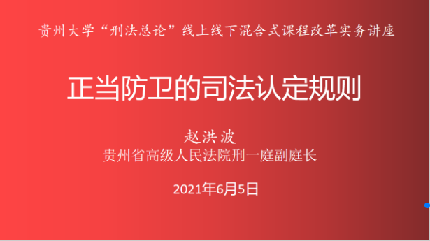 为让学生能更加充分了解刑法关于正当防卫在理论和实践中的联系与区别,6月5日上午,贵州大学法学院副教授曹波特邀贵州省高级人民法院刑一庭赵洪波副庭长,在贵州大学南校区致知楼102教室,举行以“正当防卫的司法认定规则”为题的贵州大学“刑法总论”线上线下混合式课程改革实务讲座。本场讲座由曹波副教授为学生们讲授正当行为的有关理论知识,赵洪波副庭长为学生们剖析正当防卫在司法实务中的具体运用。