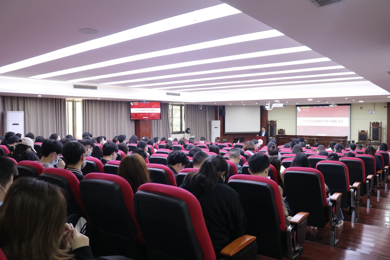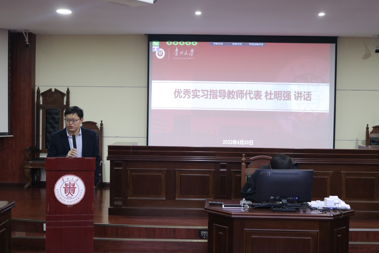 接下来,实习指导老师代表杜明强讲话,他就实习经历中所见的同学们克服疫情的重重阻碍,最终完成任务表示肯定。杜明强寄语同学们:“多阅读、勤思考、勤写作”“厚于德、诚于信、敏于行”。