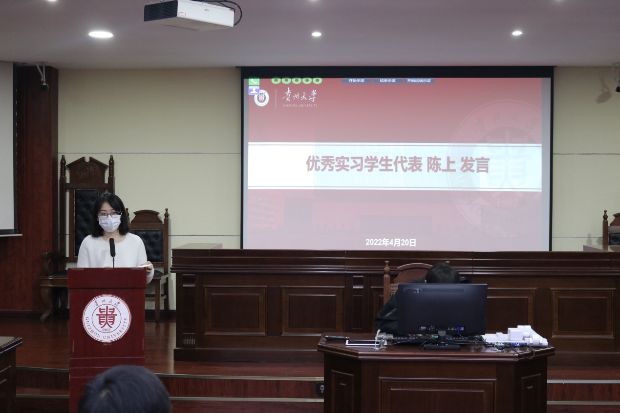 随后,实习学生代表陈上发表实习感言,分享本次实习活动的感想和收获,并代表全体实习学生对学院领导、老师和带教法官的指导和关心表示真心的感谢。