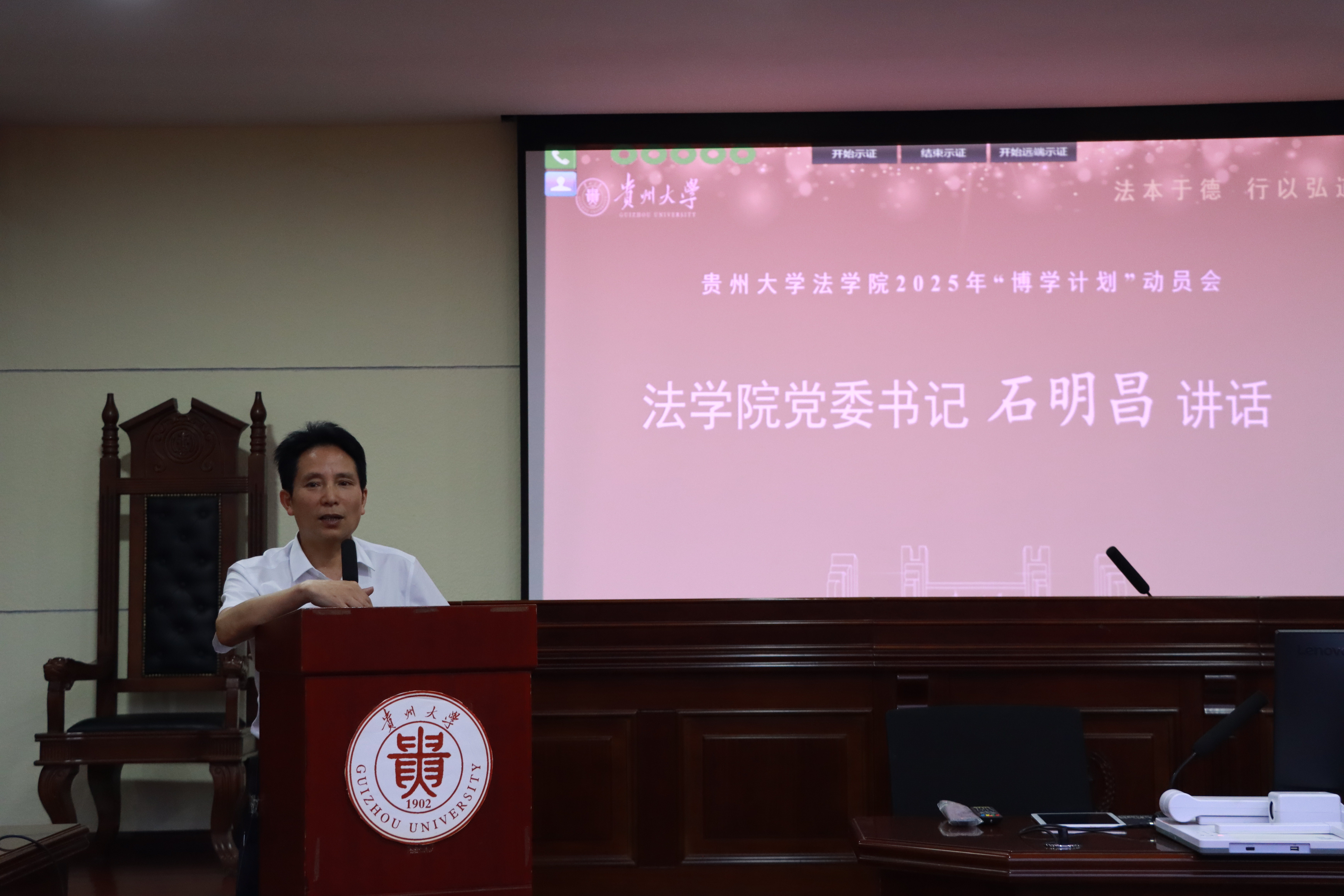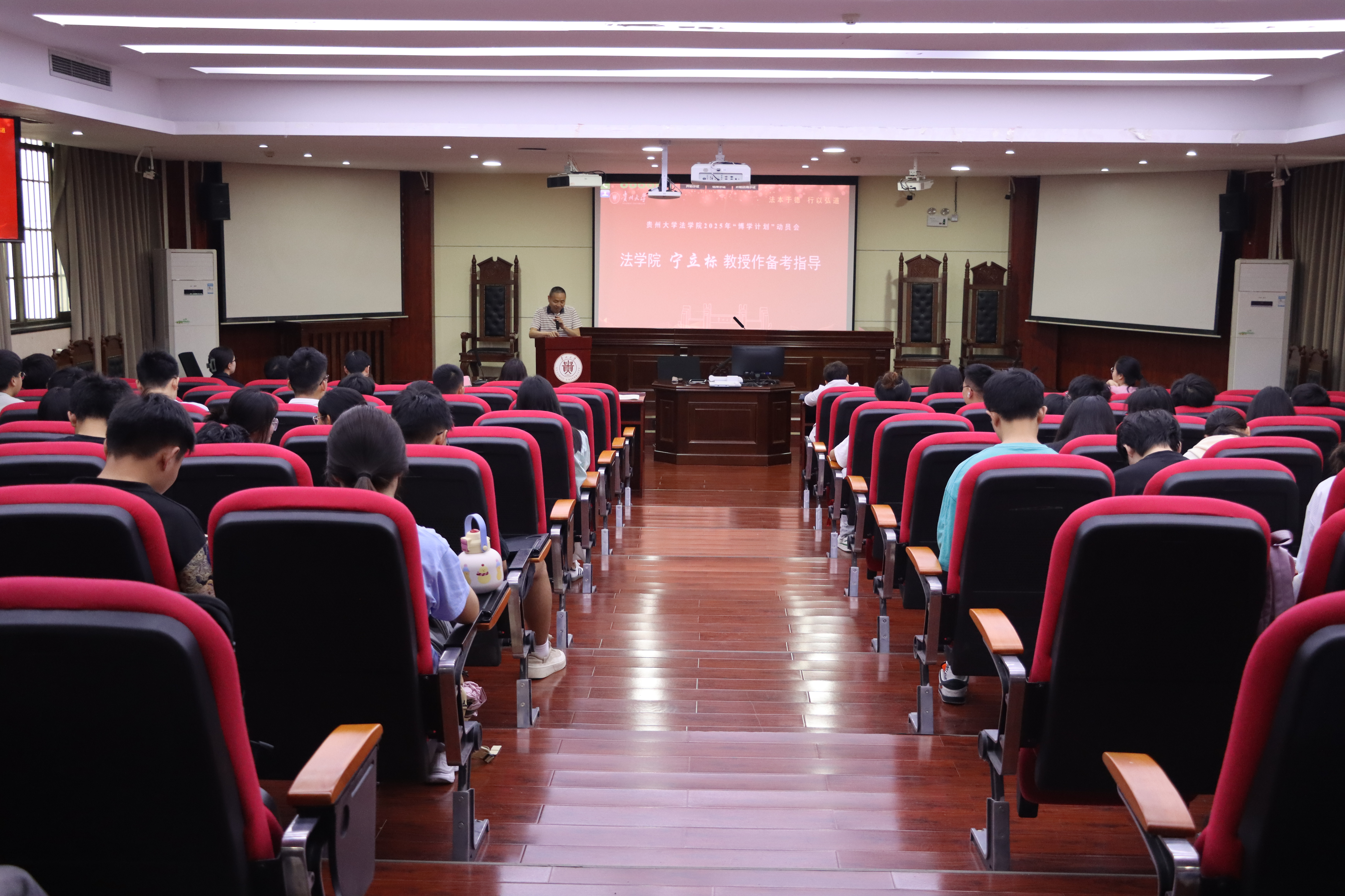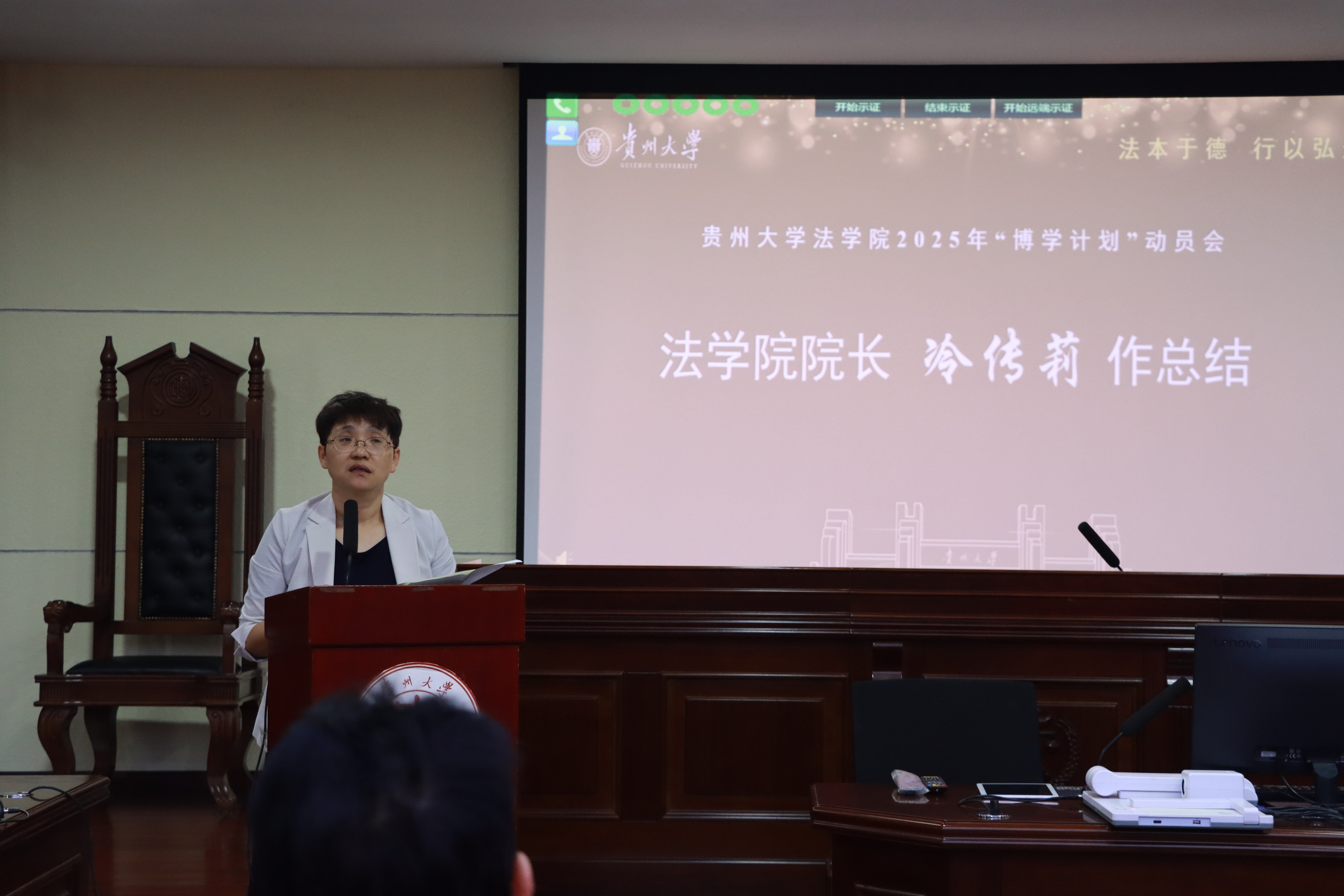 2025年6月10日上午,贵州大学法学院在东校区慎思楼模拟法庭举行2025年“博学计划”考研动员大会。会议由法学院党委副书记兼纪委书记李夏主持,法学院党委书记石明昌、院长冷传莉教授、副院长宁立标教授、张贵湘副教授及百余名有考研意向的本科学子共同参会。