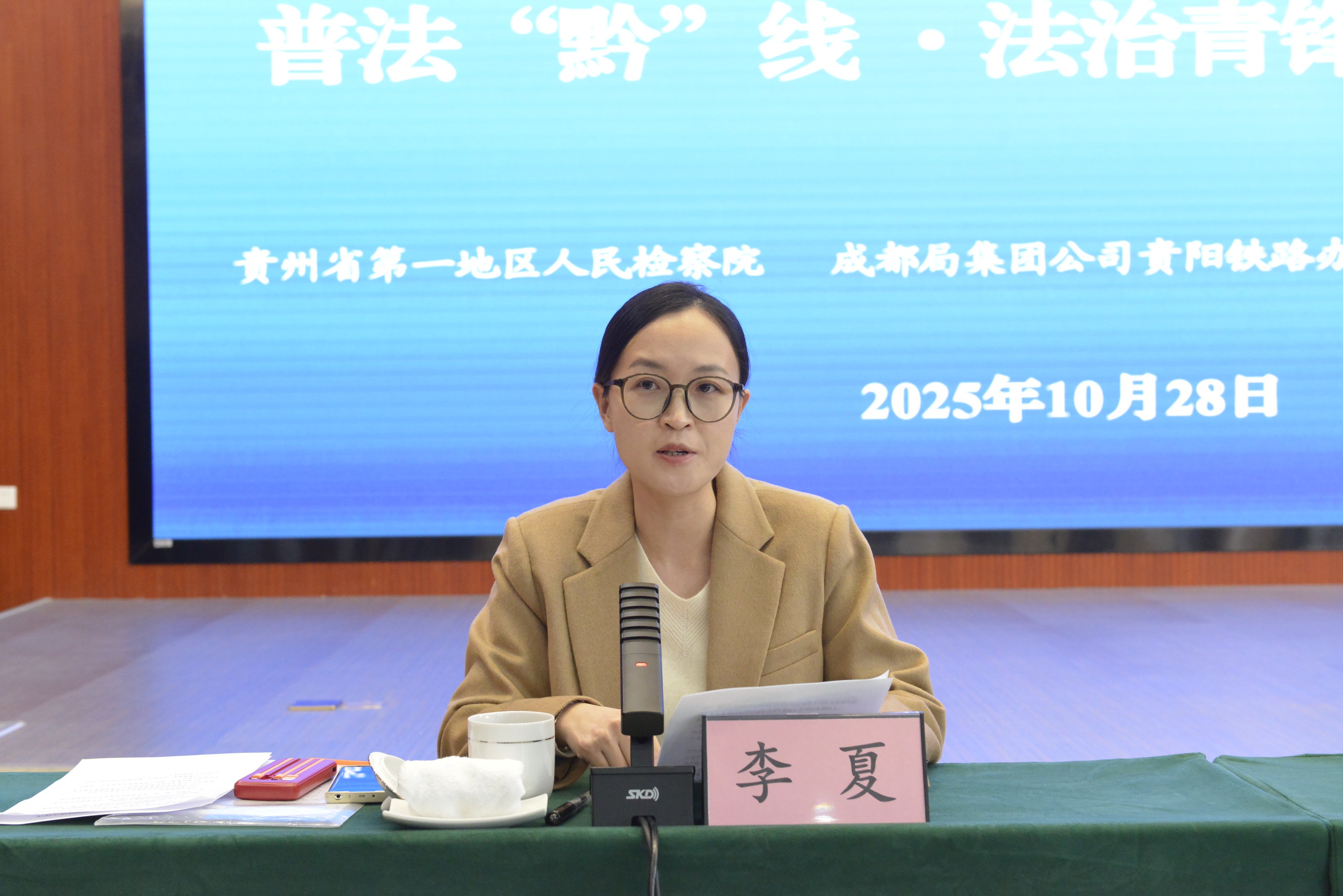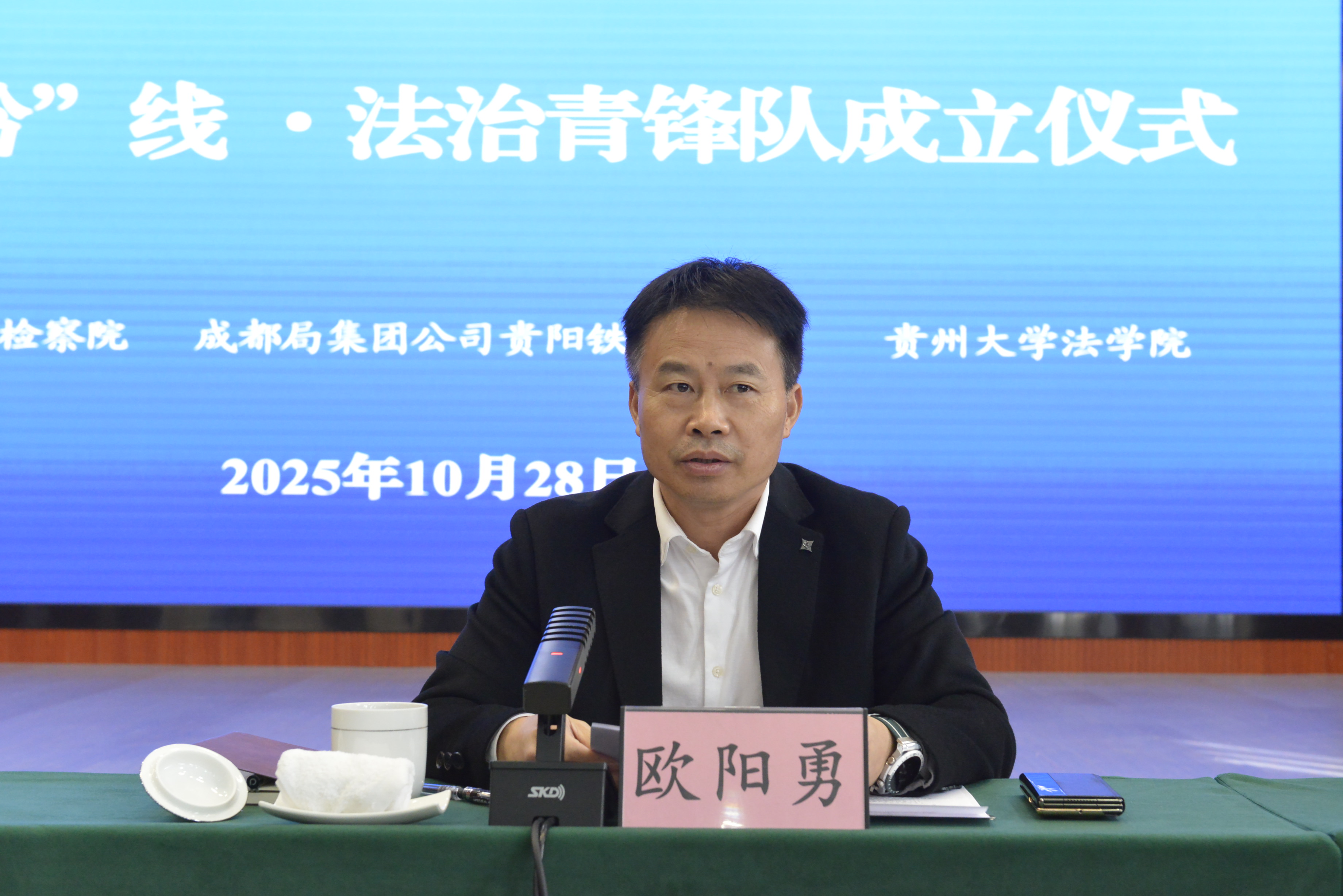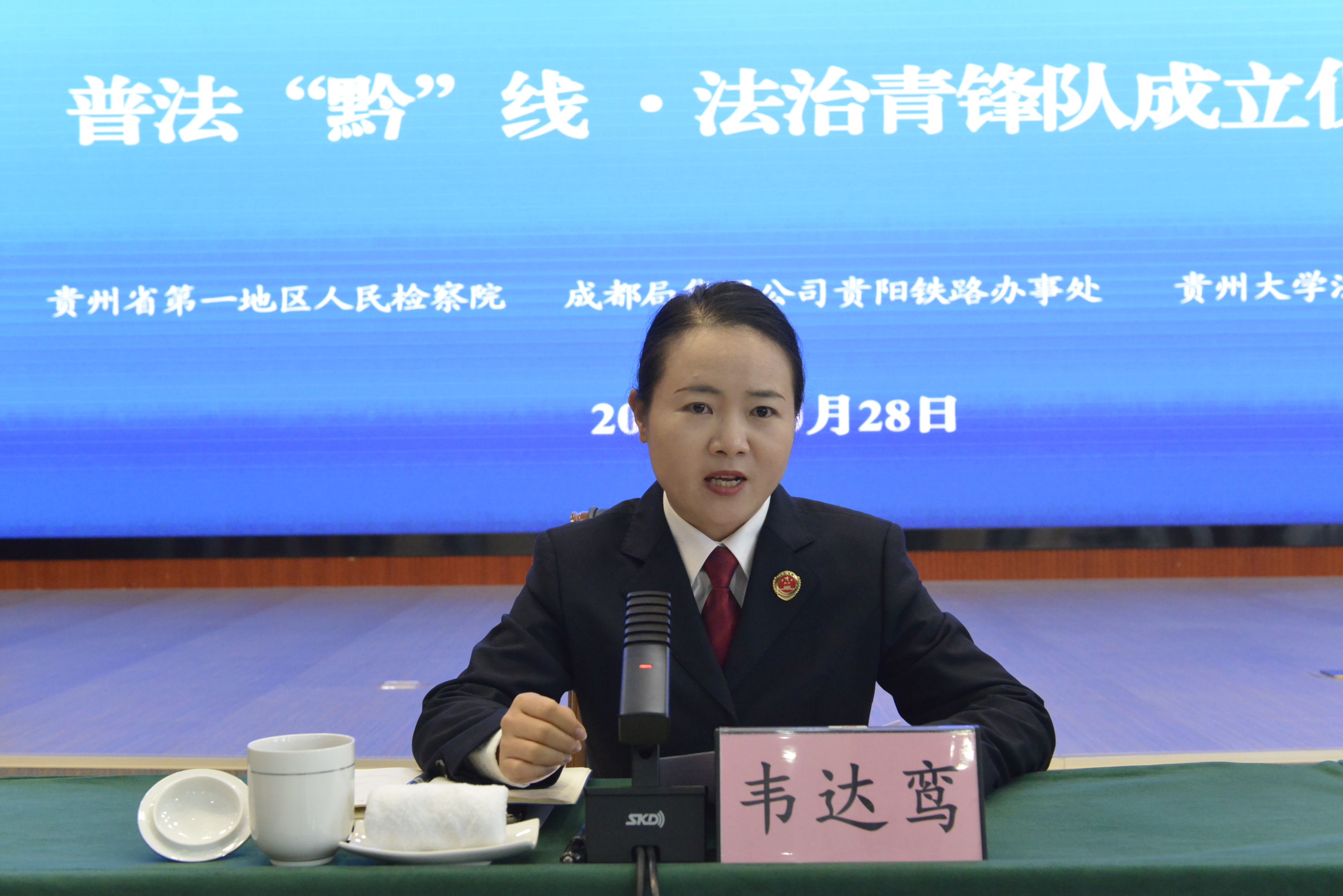 为深入学习贯彻习近平法治思想,充分发挥检企校联动法治宣传工作作用,营造全民尊法学法守法用法的良好氛围,贵州省第一地区人民检察院、中国铁路成都局集团有限公司贵阳铁路办事处与我院团委联合成立普法“黔”线·法治青锋队。2025年10月28日下午,普法“黔”线·法治青锋队启动仪式暨“检察开放日”系列活动在贵州省第一地区人民检察院举行。中国铁路成都局集团有限公司贵阳铁路办事处党委副书记、纪委书记欧阳勇,贵州省第一地区人民检察院分党组成员、检察长韦达鸾,贵州大学法学院党委副书记李夏及学院20余名学生参加活动。