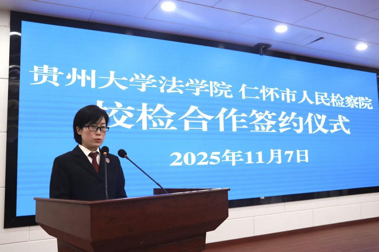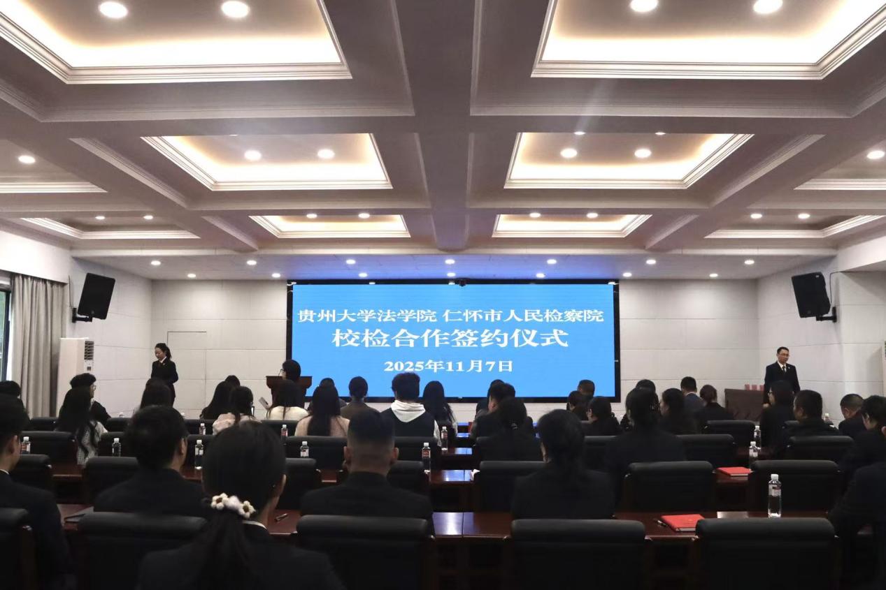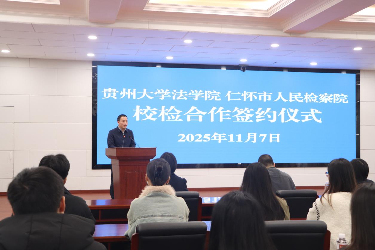 为深化法学理论与司法实践深度融合,培养高素质法治人才,服务地方法治建设,2025年11月7日,贵州大学法学院与仁怀市人民检察院在仁怀市检察院联合举办“检校融合·共创未来”主题合作活动,通过签署合作协议、共建实践基地、专题座谈等形式,开启双方协同发展新篇章。