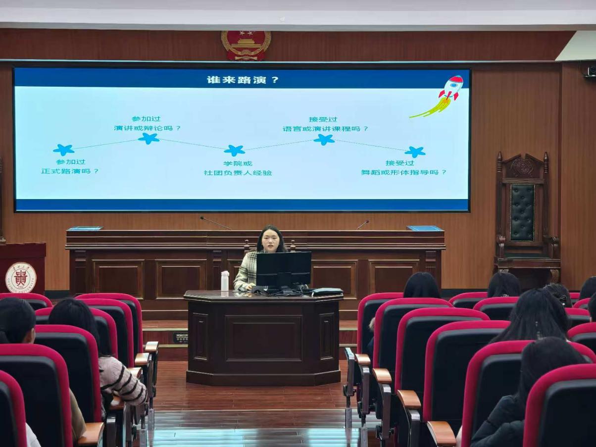 为切实激发学生科创热情、提升学生项目展示与路演实战能力,2025年11月10日,贵州大学大学生科学技术协会第二期科创百科宣讲——法学院专场“文思破界,路演锋芒”活动在贵州大学法学院模拟法庭成功举办。