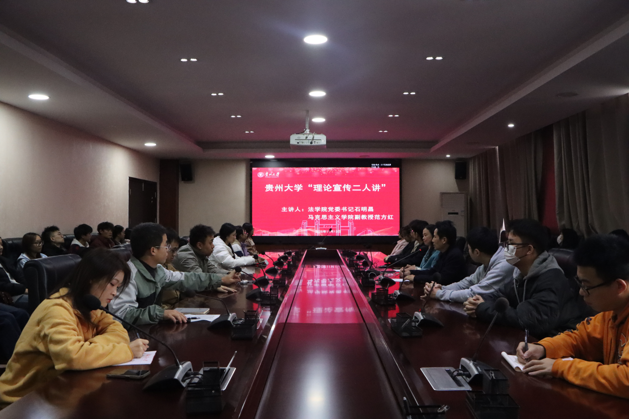 11月13日,法学院举办“理论宣传二人讲”活动,宣讲围绕“为什么要走、走什么路、怎么走好:中国特色社会主义法治道路”为主题开展。主讲人为法学院党委书记石明昌与马克思主义学院范方红副教授。