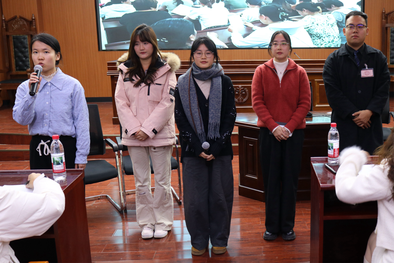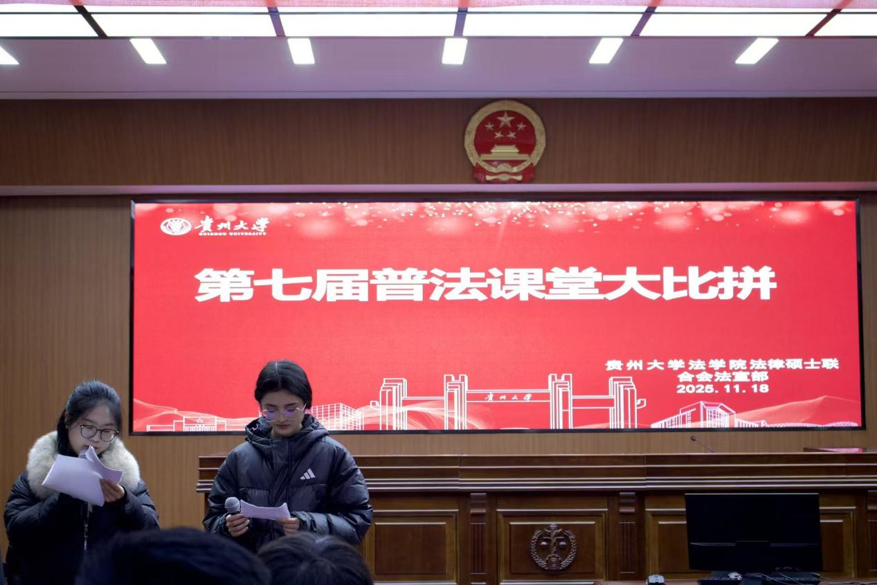 11月18日,由我院法律硕士联合会法宣部举办的贵州大学法学院第七届普法课堂大比拼在慎思楼模拟法庭举行。本次活动特邀学生科副科长谭璐出席。2024届法宣部部长李思韵、吴千喜、第六届冠军辛泽波担任本次比赛评委。