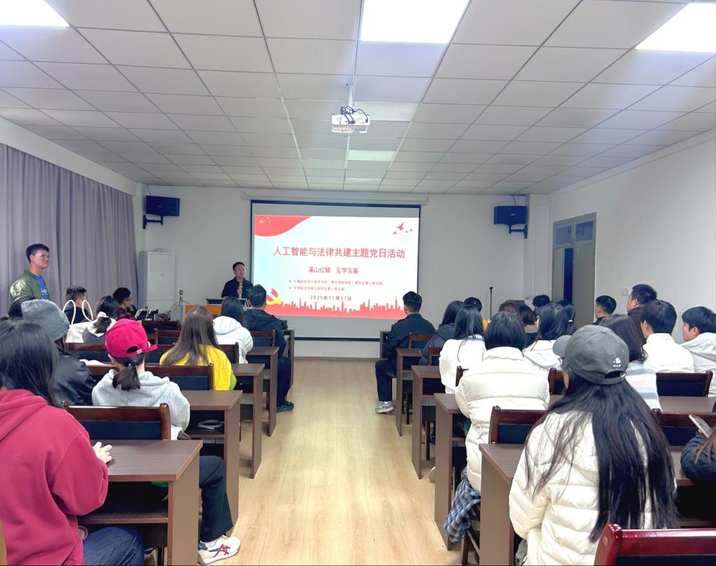 2025年11月17日,贵州大学法学院法学硕士研究生第一党支部与计算机科学与技术学院(贵州保密学院)研究生第一党支部在东校区博学楼701会议室联合开展“溪山红链·互学互鉴”之“人工智能与法律共建”主题党日活动,围绕人工智能时代的法治保障与伦理边界展开跨学科对话。