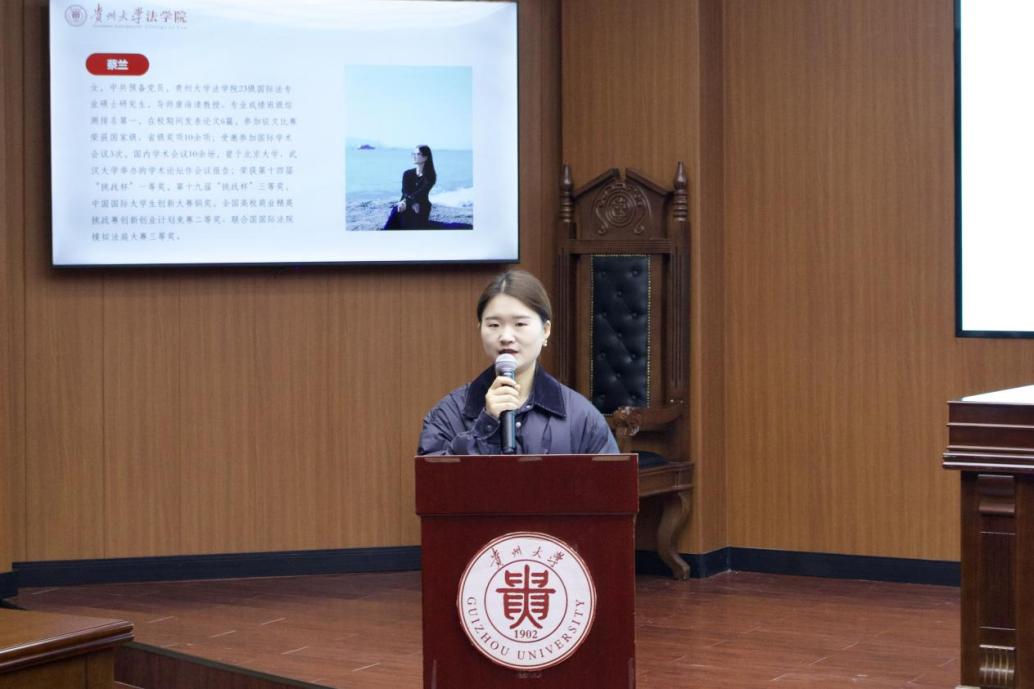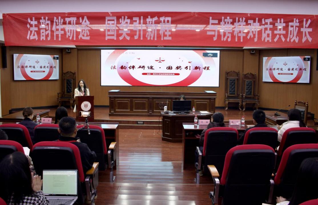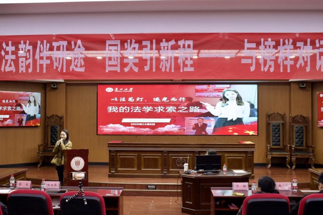 2025年12月8日,由贵州大学法学院主办的“法韵伴研途・国奖引新程——与榜样对话共成长”经验分享会在模拟法庭圆满举行。法学院团委书记谭璐出席,百余名研究生参加。活动以朋辈引领为核心,通过分享与互动交流,为法学学子搭建学术提升与职业规划平台。