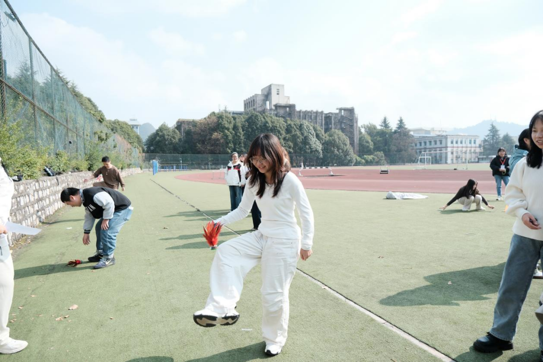 本次活动设置了踢毽子、转呼啦圈、趣味套圈、跳大绳、“你演我猜”五大项目,各项内容同步开展、有序进行。项目设计兼顾趣味性与锻炼价值,既有对协调性、平衡力的提升,也注重团队协作与默契培养,让同学们在轻松愉悦的氛围中感受运动乐趣,在互动比拼中增强身体素质。活动现场气氛热烈、秩序井然,充分展现出趣味体育活动的独特魅力。