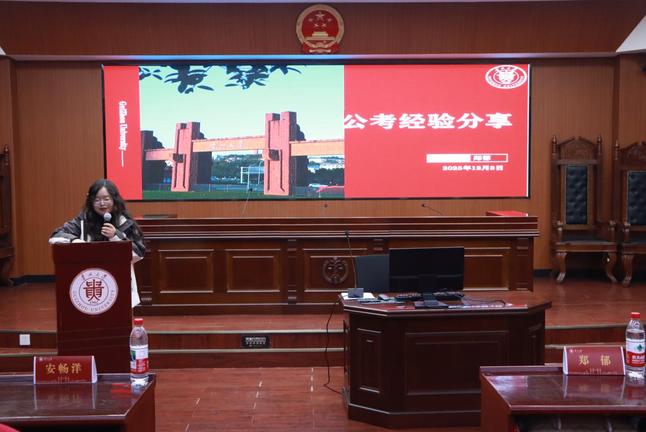 第三位分享嘉宾是来自南明区市场监督管理局的郑郁学姐。她结合自身参加贵州省考的经历,系统分享了备考方法与心路历程。她从学习经验、时间规划、岗位选择三个方面展开,建议同学们尽早明确自身需求,合理规划复习进程。
