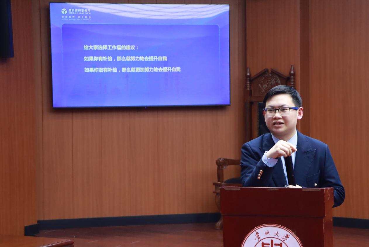 第二位分享者是北京盈科(贵阳)律师事务所的罗坤林学长。他建议同学们必须“打牢专业根基”,多参与实习面试,通过比较不同律所深化职业认知。罗坤林还送出恳切寄语:保持持续学习、以善意待人、珍惜每个机会、懂得合作共赢。